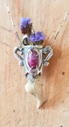 Gnostic Vessel Heirloom PendantGnostic Vessel Heirloom PendantSterling Silver, Hand-Carved Antler, RubyThis pendant was painstakingly carved and assembled from multiple wax pieces, then cast in sterling silver using the lost wax-method, making this piece truly one of a kind. After casting the piece was given a surface treatment with liver of sulfur to blacken certain areas. Finally a customized chain was added, and the antler was secured and the ruby was prong set in a long, talon style prong. These antlers are hand carved by Arizona based artist Jeremy Hawkins. This piece was intended to be worn for ceremonial purposes and special occasions and is a little too big for daily wear. The intention behind this work was also to help create an heirloom jewelry item for Jeremy to hand down to his family. Using a lot of the flowing geometric carving style, which Jeremy uses most in his artwork, my goal was to mirror this style and create one flowing design, combining geometric motifs across curving organic forms and lending a sense of history in some of the more architectural shapes and elements of this piece.This work measure about 6 inches tall and about 2 inches wide at it’s widest point, and is built into an 18” chain. Made in Oakland, Ca in August 2024.